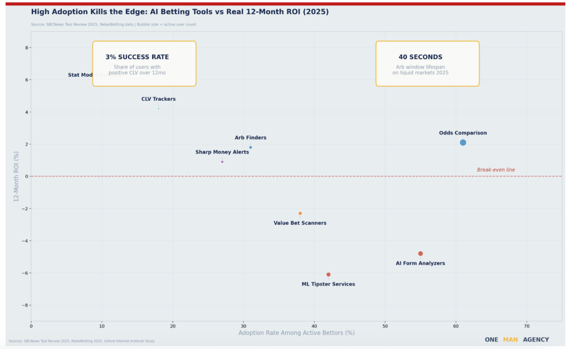 SBCNews reviewed 14 commercial AI tipster services at the end of 2025. Two of these strategies showed a positive return on investment (ROI) after 1,000 bets. Both of them worked in markets that were small and had low liquidity. The other twelve lost money. Twelve out of fourteen.