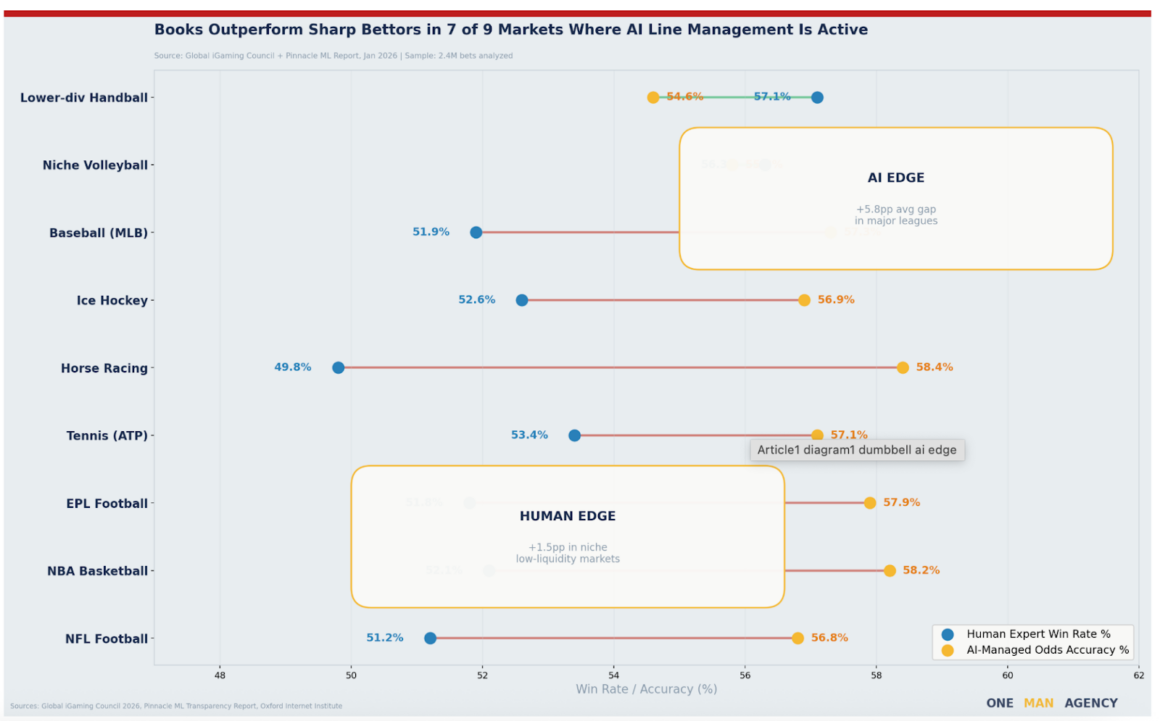Key Stat: The book’s AI is better than sharp bettors in 7 of 9 major sports markets as of Q1 2026 (Global iGaming Council). The only two sports that are different are women’s volleyball and lower-division handball. Both thin-data markets are places where the model is basically making guesses.